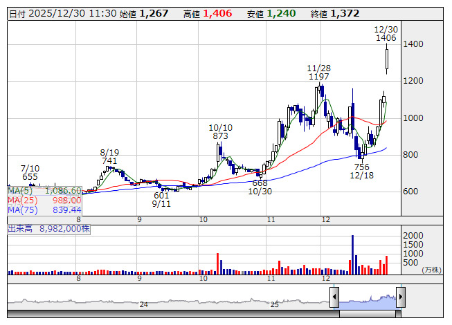 キオクシアホールディングス<285A>が続落している。NAND型フラッシュメモリーを製造する同社は、AIデータセンター向け需要の急増に伴う半導体メモリー市況高の恩恵を受ける銘柄として、幅広く投資家からの注目を集める銘柄となった。11月発表の26年3月期第2四半期累計(4~9月)決算で、直近四半期の業績が市場の高い期待に届かず失望売りに押されたものの、年末に向けて持ち直しの動きとなり、足もとで1万円トビ台での推移となっている。もっともキオクシアの株価は年初来で6倍を超す上昇となり、プライム市場の個別株で上昇率トップと好パフォーマンスが際立っていた。29日の米株式市場では協業関係にあるサンディスク<SNDK>の株価が下落したことも重荷となり、利食い売りが継続している。
