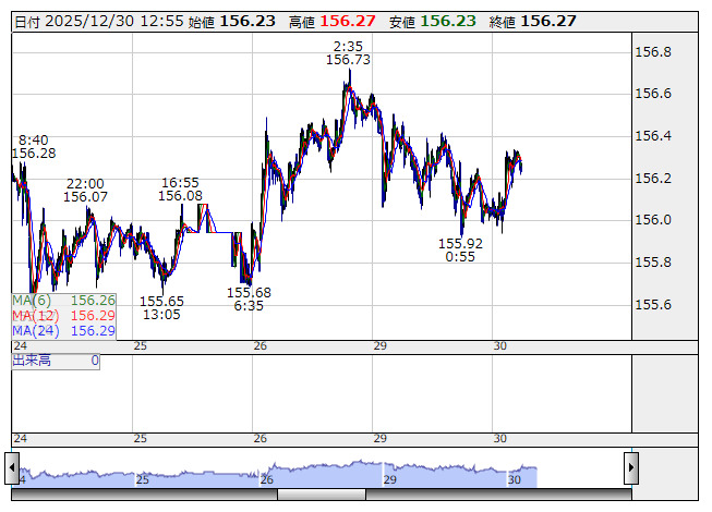2025年12月30日13時01分 【通貨】外為:1ドル156円27銭前後とドル高・円安で推移 米ドル/円 <5分足> 「株探」多機能チャートより 30日の外国為替市場のドル円相場は午後1時時点で1ドル=156円27銭前後と、前日午後5時時点に比べ20銭のドル高・円安。ユーロ円は1ユーロ=184円00銭前後と13銭のユーロ高・円安で推移している。 株探ニュース