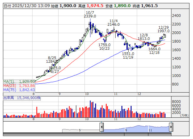 JX金属 <日足> 「株探」多機能チャートより30日の東証プライム市場で、JX金属は朝安後に値を戻し、前日比で横ばい圏で推移している。半導体製造時に使う金属の薄膜材料「スパッタリングターゲット」で世界シェア6割を誇るほか、データセンターの通信設備に使う「インジウムリン基板」の需要拡大などが評価され、今年3月の株式上場以降、株価は急上昇し、10月に2339円の高値をつけた。その後は一服状態となったが、足もとの銅価格上昇は銅精錬事業にはプラスに働くとの期待も出て、株価には再上昇機運が浮上した。ただ、上昇を続けてきた金や銅価格も足もとで波乱状態となっており、再び警戒感も台頭しているようだ。