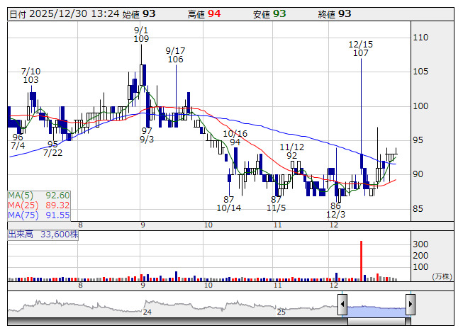 3358>は一進一退。29日の取引終了後、同社のキャラクター「しょうわんこ」をデザインに取り入れたソックス及びボクサーブリーフを2026年1月から発売すると開示したものの、手掛かり視して買い向かう姿勢は限られているもようだ。商品は九州のイオン・イオンスタイル56店舗とECサイト「イオン九州オンライン」で販売する。同社はイオン九州<