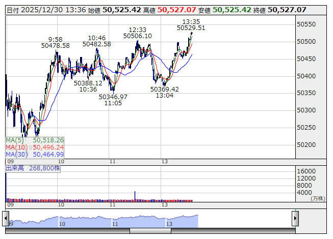 2025年12月30日13時37分 【市況】日経平均がプラス転換 日経平均 <1分足> 「株探」多機能チャートより 日経平均株価がプラス転換。13時36分現在、6.14円高の5万533.06円まで上昇している。 株探ニュース