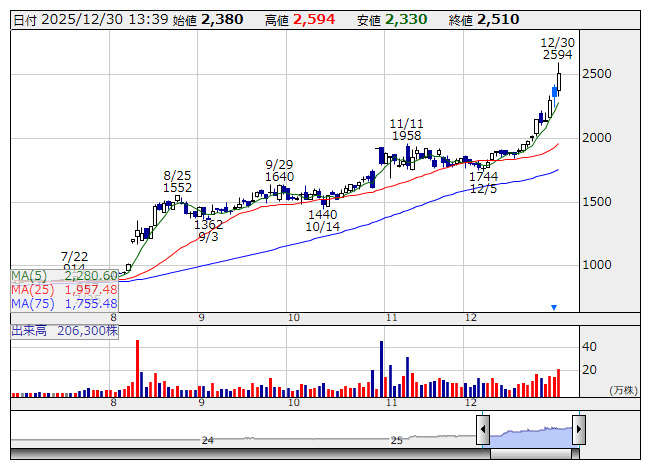 6648>は大幅高で4日続伸。上場来高値圏を快走している。同社は配電制御設備の専業メーカー。半導体関連を含む大型工場や都市再開発などの堅調な建設需要を追い風に、26年3月期の連結営業利益は前期比5割強増の40億円を予想。1992年3月期(32億3600万円)以来、実に34年ぶりとなる最高益更新を見込む。配当は前期比20円増の58円と、3期連続の増配を計画する。好業績見通しを背景に投資資金の流入が続くなか、12月末を基準日とする1対5の株式分割を実施したことで買いに弾みがついている。