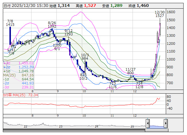 ワンプラ <日足> ボリンジャー/カイリ率 「株探」多機能チャートより●株価が+3σを上回った銘柄(市場人気順) ★株価の上げ足が速過ぎ、売りが出やすい銘柄