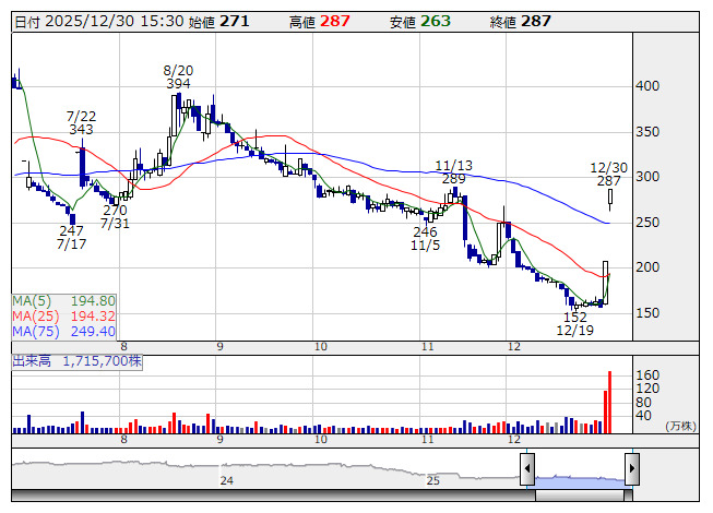 Aクリエイト <日足> 「株探」多機能チャートより●本日の株価上昇率ランキング【ベスト50】