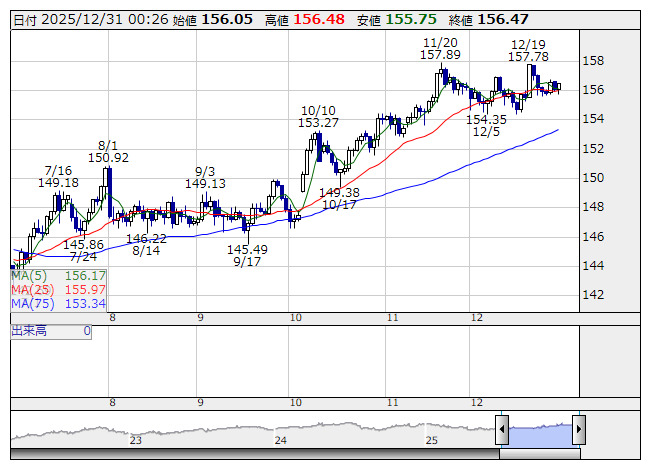 米ドル/円 <日足> 「株探」多機能チャートより米12月シカゴ購買部協会景気指数(PMI)は43.5と、11月36.3から予想以上に上昇し、10月来で最高を記録した。