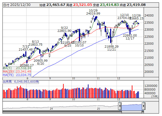 [NY市場データ]米国株式市場は続落。ダウ平均は94.87ドル安の48367.06ドル、ナスダックは55.27ポイント安の23419.08で取引を終了した。年末に向けた調整が続き、寄り付き後、まちまち。その後、手仕舞い売りが強まったほか、金利高が嫌気され、さらに、ウクライナ・ロシア和平合意期待の後退に続き、トランプ大統領がイランの核能力の再構築に懸念を表明し、再度攻撃する可能性を警告、地政学的リスクが引き続き重しとなり、相場は終日軟調に推移し、終了した。セクター別ではエネルギーや電気通信サービスが上昇した一方、自動車・自動車部品が下落。シカゴ日経225先物清算値は大阪日中比120円高の50700円。ADR市場では、対東証比較(ドル156.39円換算)で、東エレク<8035>、三菱商事<8058>、ファーストリテ<9983>などが上昇した。