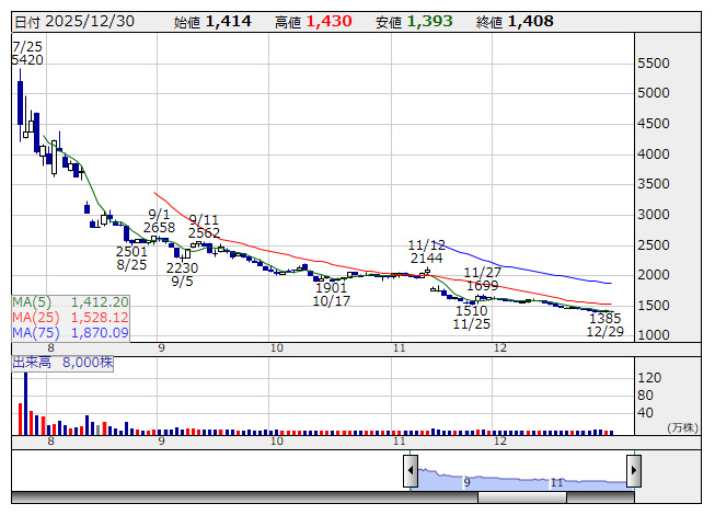 フラー <日足> 「株探」多機能チャートより―初値上昇率最大は4.4倍、IPO案件は減少も人気はやや向上―