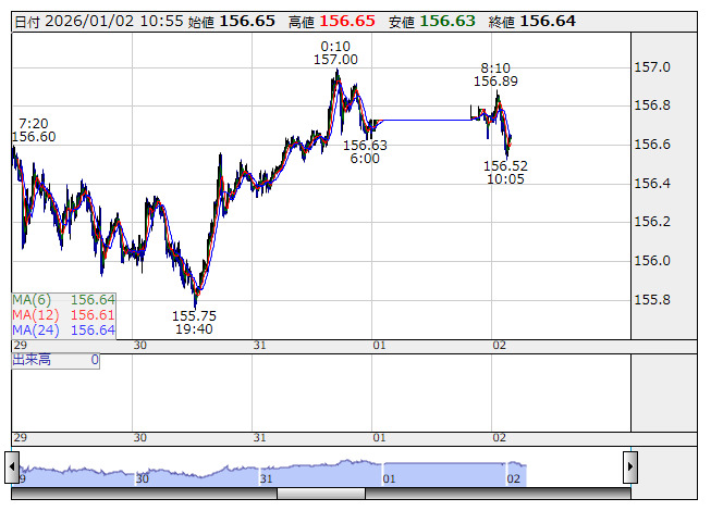 米ドル/円 <5分足> 「株探」多機能チャートより2日午前の東京市場でドル・円は156円60銭台で推移。156円89銭まで買われた後、156円52銭まで下落。ただ、顧客筋の米ドル買い注文が156円台前半以下に残されているため、米ドル・円は156円台前半で下げ渋る状態が続くとみられる。ユーロ・円は184円29銭から184円03銭まで下落。ユーロ・ドルはやや強含み、1.1746ドルから1.1762ドルまで戻す展開。