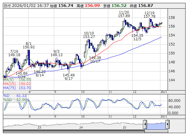 米ドル/円 <日足> Slowストキャス 「株探」多機能チャートより2日の東京市場でドル・円は反発。156円90銭台で推移。156円52銭から156円99銭まで強含み。ユーロ・円は184円03銭から184円43銭まで反発。ユーロ・ドルはやや伸び悩み、1.1765ドルから1.1742ドルまで値下がり。