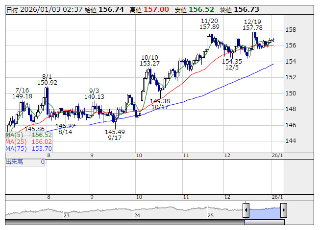 ドル・円は156円56銭まで下落後、再び156円73銭まで戻した。ユーロ・円は183円89銭で下げ止まり。ポンド・円は210円92銭から211円46銭まで上昇し、日中高値に並んだ。