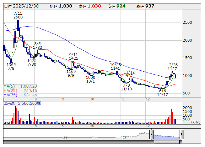 2. <4784> GMOインタ 東証P -14.4 937 権利落ちで処分売り