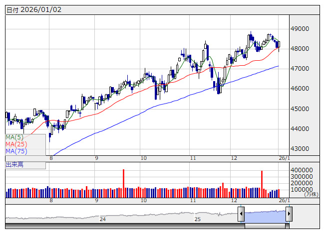 新年度入りで人工知能(AI)への期待再燃でハイテクが強く、寄り付き後、まちまち。トランプ政権が昨年末に1日から発動予定であった家具やキッチンキャビネットの関税引き上げを1年延期する計画を発表したことが買い材料となりダウ中心に相場は堅調推移した。その後、ハイテクは金利高を嫌気し下落に転じたが、ダウは終盤にかけ上げ幅を拡大しまちまちで終了。セクター別では資本財、半導体・同製造装置が上昇した一方、ソフトウエア・サービスが下落した。