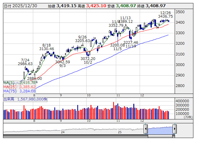 2026年01月05日08時46分 【市況】TOPIX先物:5日寄り付き=14ポイント高、3434ポイント TOPIX <日足> 「株探」多機能チャートより 5日8時45分、TOPIX先物期近2026年3月限は前営業日清算値比14ポイント高の3434ポイントで寄り付いた。前営業日のTOPIXの現物終値3408.97ポイントに対しては25.03ポイント高。 株探ニュース