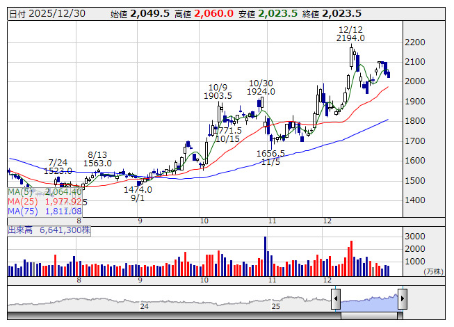 昨年12月12日につけた2194円をピークに調整をみせているが、上向きで推移する25日線が支持線として機能している。パラボリックは陰転シグナルを発生させているが、SAR値は2086円辺りまで低下してきたため、シグナル好転へのハードル高くないだろう。一目均衡表では雲を上回っての推移を続けており、直近の調整では転換線が支持線として意識されている。