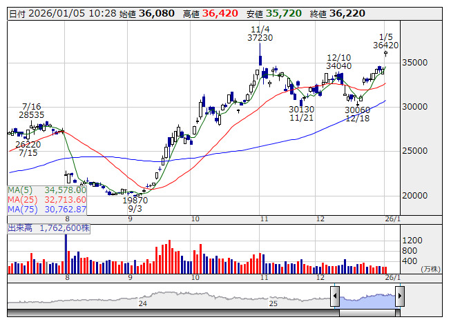 2026年01月05日10時28分 【材料】東京エレクトロン---大幅続伸、マイクロンはじめ海外半導体株の上昇を映し 東エレク <日足> 「株探」多機能チャートより 東京エレクトロン<8035>は大幅続伸。先週末の米国市場ではSOX指数が4%高と急伸しており、年明け初日の本日、同社をはじめ半導体関連株は買い優勢の展開となっている。SOX指数は30日、31日と続落基調となっていたが、先週末はマイクロンが10%超高、インテルも6%超の上昇、AMDなども4.3%超の上昇となっている。なお、ASMLやTSMCなど米国外半導体関連株も強い動きとなっている。 《HM》 提供:フィスコ