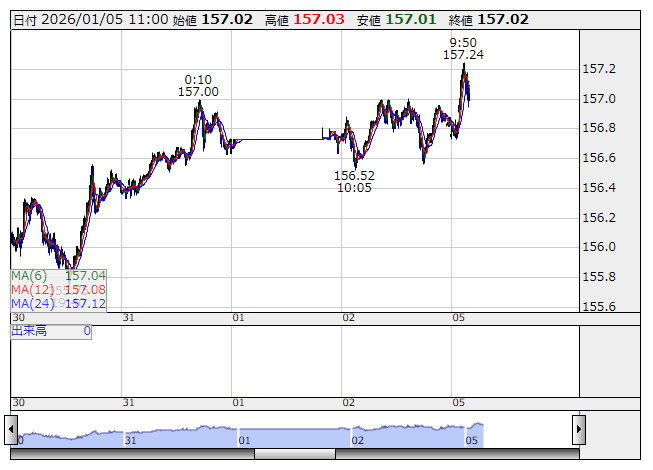 2026年01月05日11時01分 【通貨】外為:1ドル157円01銭前後とドル高・円安で推移 米ドル/円 <5分足> 「株探」多機能チャートより 5日の外国為替市場のドル円相場は午前11時時点で1ドル=157円01銭前後と、前週末午後5時時点に比べ15銭のドル高・円安。ユーロ円は1ユーロ=183円71銭前後と36銭のユーロ安・円高で推移している。 株探ニュース