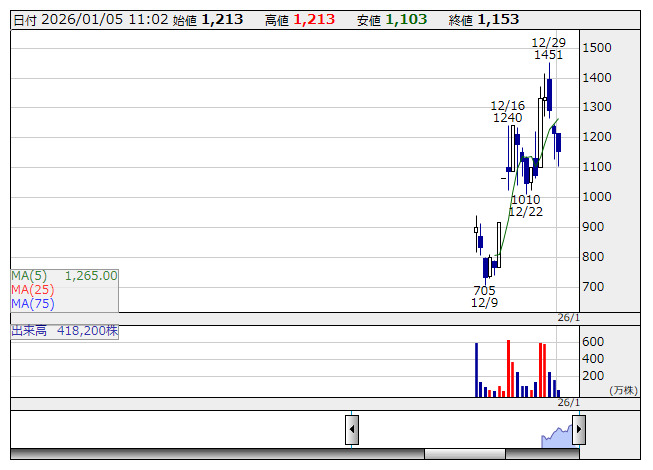 大幅続落。30日の取引終了後に、第三者割当増資の結果を発表し、これを嫌気した売りに押されている。同社普通株式374,800株の第三者割当増資による募集株式の発行について、割当先である野村證券が割当に応じたとしている。今回の第三者割当増資は、オーバーアロットメントによる売出しに関連して、同社株主であるJCCより借入れた同社普通株式の返却を目的として、野村證券に対し行われる。