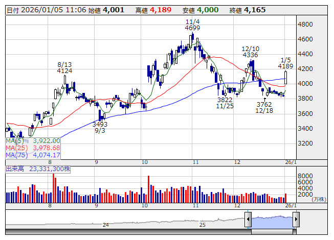 2026年01月05日11時06分 【材料】三菱重工---大幅反発、地政学リスクの高まりを意識 三菱重 <日足> 「株探」多機能チャートより 三菱重工<7011>は大幅反発。同社はじめ重工大手3社が大幅高、東京計器なども買い優勢となっており、防衛関連株に関心が向かう展開ともなっている。米国がベネズエラに攻撃を仕掛け、マドゥロ大統領を拘束などと伝わっている。中国への抑止力につながるとの見方もある一方、中国政府が台湾の指導部に対し同様の行動を試みる可能性との意見もあり、2026年の地政学リスクの高まりが意識される形につながっているもよう。 《HM》 提供:フィスコ
