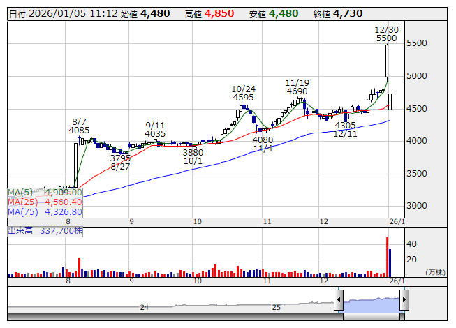 2540>は大幅反落。非公開化に向けた入札で米投資会社KKRに付与した優先交渉権を失効させたと発表している。筆頭株主の湯沢から株式売却の応諾を得られなかったもよう。30日朝の時点では優先交渉権の付与を明らかにし、同日の株価は急騰する展開になっていた。今後の交渉の行方は不透明であるものの、KKRが提案していたTOB価格は4282円であったことも明らかになっており、先週末終値5480円から、プレミアム期待は行き過ぎとの見方にも。