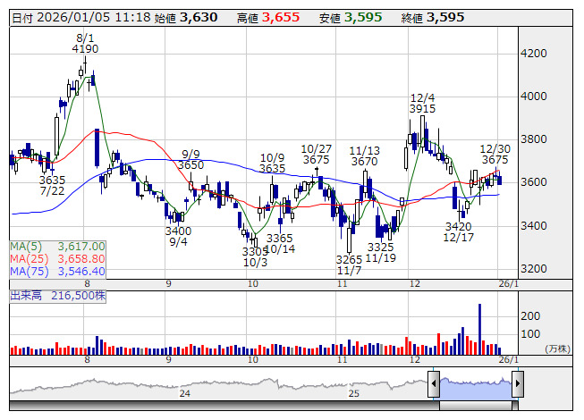 オークマ <日足> 「株探」多機能チャートより■財務省 : 1月5日受付