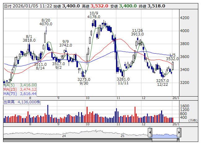 2026年01月05日11時23分 【材料】第一三共---大幅反発、3000億円を投じてADC薬を増産へ 第一三共 <日足> 「株探」多機能チャートより 第一三共<4568>は大幅反発。日本と米国、ドイツ、中国の4カ国に総額で約3000億円を投じ、「抗体薬物複合体(ADC)」と呼ぶ技術を使う医薬品の製造工場などを新設すると報じられている。ADC薬のピーク時の需要見通しが「当初予想の約1.5倍に上振れる」とみているもようで、世界で生産増強を進めていく方針。強みを持つ抗がん剤分野での積極投資をポジティブに捉える動きが先行へ。 《HM》 提供:フィスコ