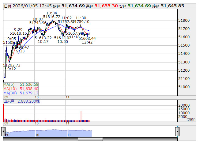 日経平均は大幅反発。1419.62円高の51759.10円(出来高概算11億5183万株)で前場の取引を終えている。1月2日の米国市場でダウ平均は319.10ドル高の48382.39ドル、ナスダックは6.36ポイント安の23235.63で取引を終了。新年度入りで人工知能(AI)への期待再燃でハイテクが強く、寄り付き後、まちまち。トランプ政権が昨年末に1日から発動予定であった家具やキッチンキャビネットの関税引き上げを1年延期する計画を発表したことが買い材料となりダウ中心に相場は堅調推移。その後、ハイテクは金利高を嫌気し下落に転じたが、ダウは終盤にかけ上げ幅を拡大しまちまちで終了した。米株市場を横目に、1月5日大発会の日経平均は前営業日比670.80円高の51010.28円と反発でスタート。フィラデルフィア半導体(SOX)指数が大幅に上昇していた流れを受け、値がさハイテク株中心に指数をけん引する格好となっており、寄り付き後も上げ幅を大きく広げた。一時51800円を超える場面も見られ、前引けにかけても高値圏で推移した。