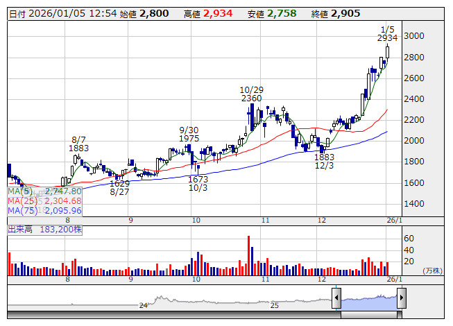 6469>が大幅高、大納会前日の12月29日につけた上場来高値2802円を上回り青空圏に再突入。2934円まで上値を伸ばし、未踏の3000円大台乗せを目前に捉えている。金属放電加工の専業だが、特殊工程認証で業界トップクラスの実力を有する。三菱重工業<