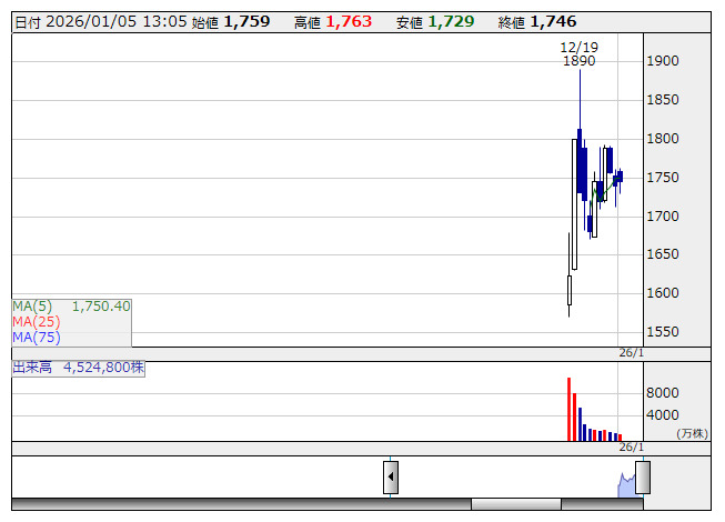 SBI新生銀 <日足> 「株探」多機能チャートよりSBI新生銀が3日ぶりに小反発。同社は昨年12月17日に東証プライム市場に新規上場しており、初値は1586円と公開価格(1450円)を9.4%上回った。19日に1890円まで買われ、その後も堅調な値動きが続き、足もとでは1750円前後で推移している。SBIグループの中核銀行として「第4のメガバンク構想」を通じた地域金融機関との連携を進めている。金利上昇は利ざや拡大となり追い風が期待されるほか、今月末のTOPIXへの組み入れも株価のプラス要因とみられている。ただ、株価は1700円台の一進一退が続くなか、上値では利益確定売りも警戒されている様子だ。