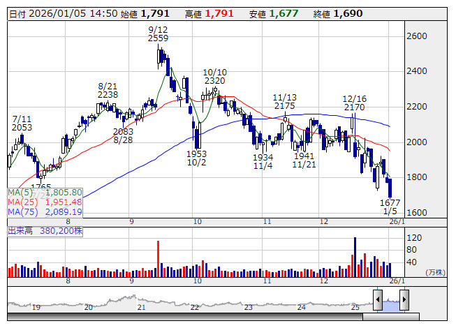 続落。運営するAI不動産投資「RENOSY(リノシー)」において、7つの質問に回答すると大家タイプがわかる「不動産投資かんたんAI診断」を開始したと発表し、反発して始まるも上値は重い。同診断は、職業や不動産投資に期待していることなど7つの質問に回答すると、AIがリスク許容度や資金活用力に応じた傾向を分析し、大家タイプが診断されるもので、診断されたタイプに近い投資用不動産オーナーが過去に選んだ物件や口コミ体験談も確認することができ、今後の資産形成の参考にできるとしている。