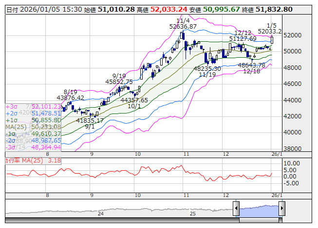 日経平均 <日足> ボリンジャー/カイリ率 「株探」多機能チャートより大発会5日の日経平均は3営業日ぶりに急反発した。昨年11月4日以来約2カ月ぶり52000円まで上値を伸ばし、ローソク足は陽線で終了。上向きの5日移動平均線を上放れて強い買い意欲を窺わせた。5日線下方で緩やかに上昇する25日線との乖離率は3.18%と過熱ラインの5%には届かず、上値余地を残した格好だ。ボリンジャーバンドでは本日終値が+2σを突破。各バンド間隔が拡大する5本線発散が始まっており、もみ合い相場の終了と上値追い局面入りが予想される。