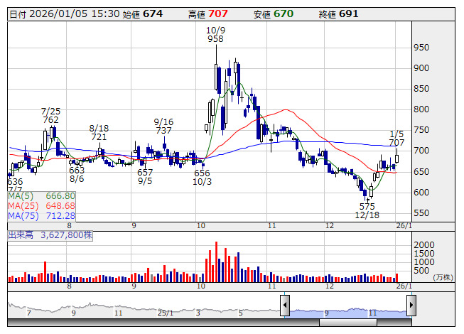 アストロHD <日足> 「株探」多機能チャートより■アストロHD <186A> 691円 (+33円、+5.0%)