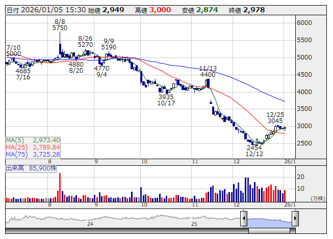 2026年01月06日06時20分 【注目】本日注目の【自社株買い】銘柄 (5日大引け後 発表分) Arent <日足> 「株探」多機能チャートより ○Arent <5254> [東証G] 発行済み株式数(自社株を除く)の3.0%にあたる20万2000株(金額で7億円)を上限に自社株買いを実施する。買い付け期間は1月6日から27年1月5日まで。 [2026年1月6日] 株探ニュース