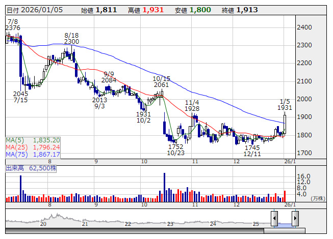 サーバワクス <日足> 「株探」多機能チャートより銘柄名<コード>5日終値⇒前日比