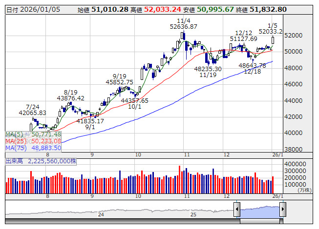 6日の東京株式市場は買い優勢の展開が継続し、日経平均株価は5万2000円台乗せが視野に入りそうだ。前日はザラ場に一時1700円近い上昇で5万2000円台に乗せる場面があったが、きょうは終値での大台替えができるかどうかが注目される。前日の欧州株市場では高安まちまちながら、ドイツやフランスなどGDP上位国の株式市場は堅調で、独DAXに関しては1.3%高で昨年10月上旬以来約3カ月ぶりに史上最高値更新を果たした。トランプ米政権による南米ベネズエラへの軍事攻撃も特にこれを悪材料視する動きはなく、独ラインメタルなど防衛関連株への買いを誘導し、全体指数に押し上げ効果が反映される格好となっている。また、欧州主要600社で構成されるストックス・ヨーロッパ600も最高値を更新した。米国株市場でも、ベネズエラ攻撃がむしろエネルギー関連株などの株価刺激材料となり、市場センチメントを強気に傾けているが、これはトランプ大統領がベネズエラの石油インフラ再構築に積極的な姿勢をみせていることが背景にある。個別では石油メジャーの一角であるシェブロン<