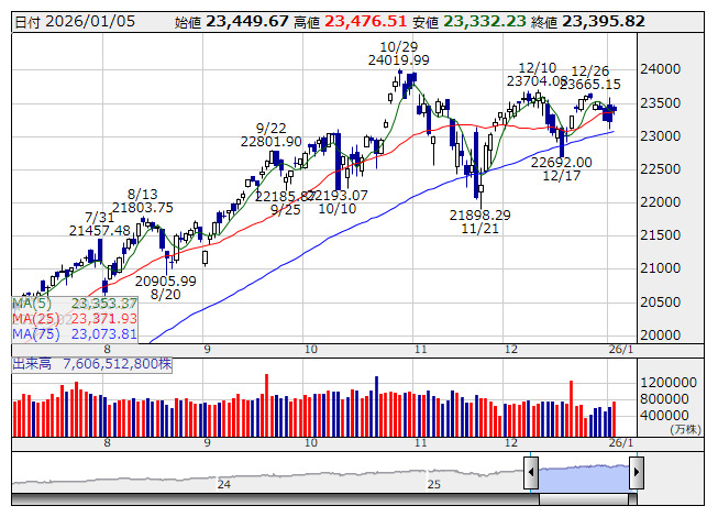 NASDAQ <日足> 「株探」多機能チャートより本日の東証グロース市場250指数先物は、買い優勢の展開を予想する。前日5日のダウ平均は594.79ドル高の48977.18ドル、ナスダックは160.19ポイント高の23395.82で取引を終了した。トランプ政権によるベネズエラへの軍事介入でエネルギーや防衛セクターがけん引し、寄り付き後、上昇。金利安も支援し、相場は終日買いが先行した。終盤にかけて上げ幅を拡大し、ダウは過去最高値を更新し、終了。本日の東証グロース市場250指数先物は買い優勢の展開となりそうだ。地政学的リスクは払しょくされていないものの、米国の金利安に加え、グロース市場と逆相関に近いAI・半導体関連銘柄が米株高を主導したわけではないため、朝方から堅調地合いが予想される。5日移動平均線を回復したことに加え、ストキャスティクスやRSIといったオシレーター系指標も中位水準にとどまっており、テクニカル面でも買いに分がありそうだ。なお、夜間取引の東証グロース市場250指数先物は前営業日日中終値比7pt高の674ptで終えている。上値のメドは685pt、下値のメドは665ptとする。