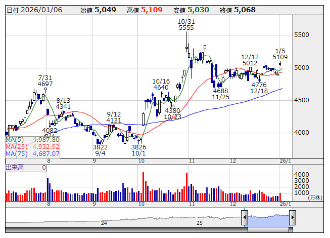 日立 <日足> 「株探」多機能チャートより1月6日9時03分37秒現在、特別買い気配は35銘柄、特別売り気配は4銘柄となっている。