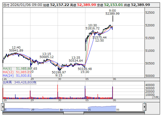 2026年01月06日09時04分 【市況】日経平均の上げ幅が500円突破 日経平均 <5分足> 「株探」多機能チャートより 日経平均株価の上げ幅が500円を突破。9時3分現在、531.54円高の5万2364.34円まで上昇している。 株探ニュース
