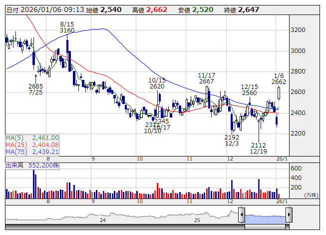 GYRE>が、中国国家薬品監督管理局(NMPA)の医薬品評価センター(CDE)との間で、新薬承認申請(NDA)に向けた事前協議を完了したと発表。これを材料視した買いが入ったようだ。ジャイア・セラピューティクスは昨年5月、中国で開発を進める肝線維症治療薬「F351」の第3相臨床試験に関し、主要評価項目を達成したと発表。2021年にはCDEより画期的治療薬の指定を受けていた。ジャイア・セラピューティクスは今年上半期のNDAの提出を目指すとともに、条件付き承認から本承認への移行に向けた検証的臨床試験の実施準備を進める。