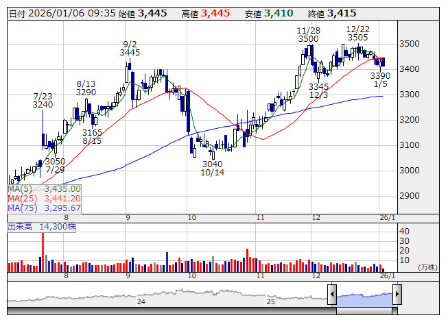 2026年01月06日09時35分 【材料】コメリが反落、12月既存店売上高が3カ月ぶり前年下回る コメリ <日足> 「株探」多機能チャートより コメリ<8218>が反落している。5日の取引終了後に発表した25年12月度の月次状況で、既存店売上高が前年同月比3.1%減と3カ月ぶりに前年実績を下回ったことが嫌気されている。 肥料や農薬などの農業関連商品の販売は引き続き堅調なものの、全国的に気温が高かった影響で暖房用品の販売が低調に推移した。また、日本海側では降雪量が平年より少なかったことから、防寒衣料や除雪用品も販売が冴えなかった。なお、全店売上高は同2.0%減だった。 出所:MINKABU PRESS