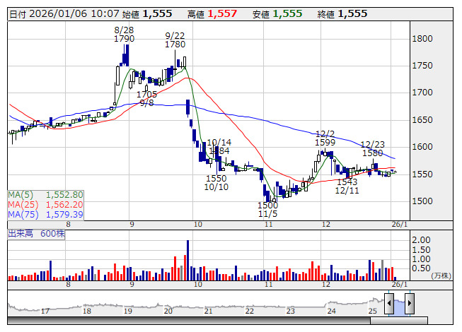 昭栄薬品 <日足> 「株探」多機能チャートより昭栄薬品<3537>は26日、東京証券取引所が公表した「資本コストや株価を意識した経営」に関する「投資者の視点を踏まえた対応のポイントと事例:事例集2025 スタンダード市場編」において、同社の取り組みが好事例として選定されたと発表した。