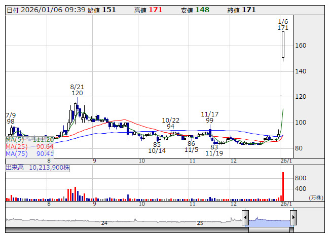 日本精密 <日足> 「株探」多機能チャートより個別では日本精密<7771>がストップ高。日本電技<1723>、大本組<1793>、イチケン<1847>、北野建設<1866>、金下建設<1897>など95銘柄は昨年来高値を更新。日本エマージェンシーアシスタンス<6063>、ETSグループ<253A>、千代田化工建設<6366>、unbanked<8746>、イー・ロジット<9327>は値上がり率上位に買われた。