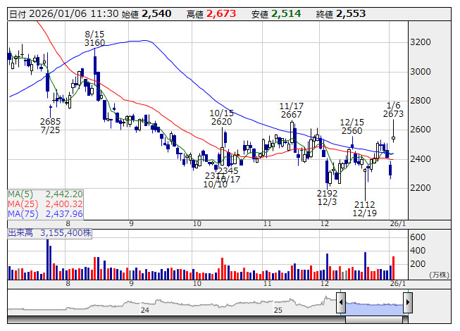 ソフトバンクグループ<9984>が続伸。前日は5%近い上昇をみせ上向きの5日・25日移動平均線を放れる形となったが、きょうも目先筋の売りをこなし上値追い態勢を維持している。前日の米国株市場ではNYダウが最高値を更新し、ハイテク株比率の高いナスダック総合株価指数も6営業日ぶりに反発に転じており、米ハイテク企業に積極投資する同社に追い風となっている。また、同社傘下の英半導体設計大手アーム・ホールディングス<ARM>は年明けから2営業日続伸し、昨年から数えた直近5営業日で4勝1敗と底値圏からの戻り足を明示していることもポジティブ材料だ。米国ではAIや半導体関連に対する過度な不安シナリオの修正局面にあり、東京市場でもAI関連の象徴である同社株に目先値ごろ感からの買いが向かっている。米国時間6日から9日までの日程で世界最大のテクノロジー見本市であるCESが開催され、同社の孫正義会長兼社長が注力姿勢を明示しているフィジカルAIが中核テーマとなっていることも思惑を呼ぶ。ソフトバンクGを株式需給面の切り口でみても昨年は歴史的な1年となった。国内外機関投資家にとどまらず、個人投資家マネーを誘引し、株価上昇もさることながら商い面での増勢が顕著だった。昨年1年間の売買代金は48兆円超となり、全上場企業のなかで首位に輝いているだけに、今年のAI相場の行方を占ううえでも同社株の復元があるかないかにマーケットの関心も高い。