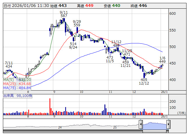 明豊エンタ <日足> 「株探」多機能チャートより明豊エンタープライズ<8927>は5日、2025年12月における不動産開発事業の月次仕入及び販売状況を発表した。