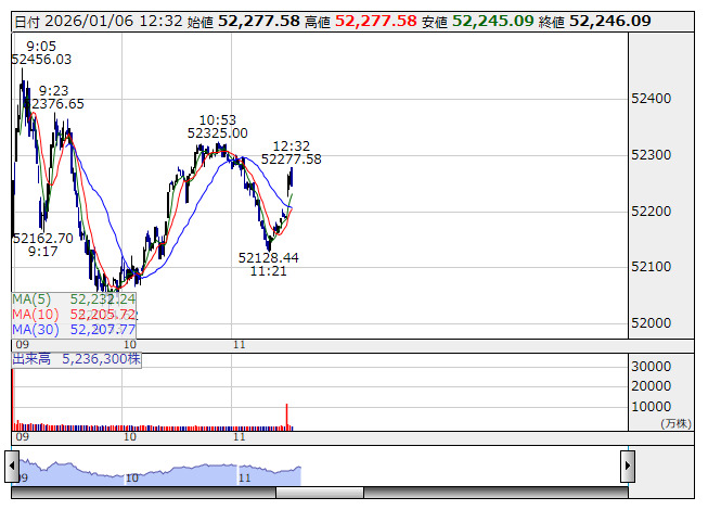 2026年01月06日12時32分 【市況】東京株式(後場寄り付き)=日経平均株価は前場終値比で上げ幅広げる 日経平均 <1分足> 「株探」多機能チャートより 後場寄り付き直後の東京株式市場では、日経平均株価が前営業日比430円高前後と前場終値と比較して上げ幅を広げている。外国為替市場では1ドル=156円40銭近辺の推移。 出所:MINKABU PRESS