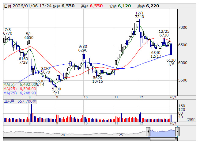 7564>は大幅反落。前日に12月の月次動向を発表している。既存店売上高は前年同月比2.0%減となり、10カ月ぶりのマイナス成長となっている。客単価が同2.0%上昇した一方、客数が同3.9%減少した。アウターやウォームパンツ、手袋などの冬物商品が低調に推移したようだ。25年3月以降の既存店売上回復に伴って株価も上昇してきたことから、ネガティブな反応が強まる格好へ。なお、第3四半期累計の全店売上高は前年同期比12.0%増となっている。