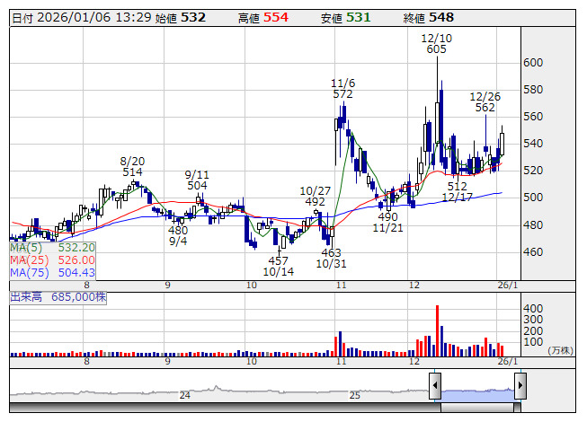 CIJ <日足> 「株探」多機能チャートよりCIJは続伸し500円台半ばに歩を進めている。独立系システム開発会社で高度な技術力に定評があり、NTTデータグループや日立製作所<6501>から開発案件を受託している。ロボティクス分野に早くから取り組み、自律移動できるAIサービスロボット「AYUDA(アユダ)」は人間との共生・共存を目指すヒューマノイドとして需要の裾野が広がっている。昨年12月25日には、日立の「デジタルシステム&サービスセクター」との間で業務提携契約を締結したことを発表、システム開発や人材育成で協業し業容拡大につなげる構えだ。