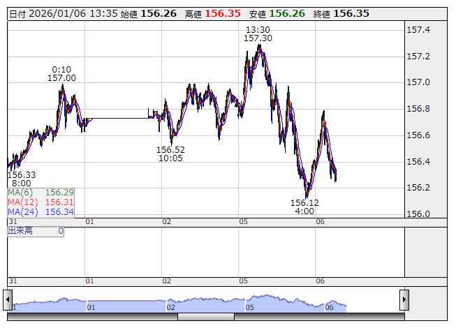 米ドル/円 <5分足> 「株探」多機能チャートより6日午後の東京市場でドル・円はじり安となり、156円24銭まで下値を切り下げた。米国経済の減速懸念でドル売り地合いに振れやすく、欧州やオセアニアの主要通貨は対ドルで堅調を維持。一方、日経平均株価は続伸も、円売りは小幅にとどまっている。