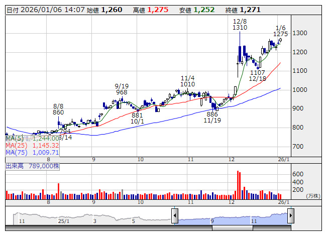 リガクHD <日足> 「株探」多機能チャートよりリガク・ホールディングス<268A>は、X線技術を中心とした分析機器を開発・製造・販売する企業であり、半導体、電子部品、二次電池、医薬品、化学、鉄鋼、大学・研究機関など、多様な分野に計測ソリューションを提供している。X線回折機器(XRD)世界市場シェアでは26%と2位を誇るほか、リピート需要の獲得率は95%以上にのぼる。高度情報化/AI化社会を支える最先端半導体デバイスの開発や製造、持続可能な社会を実現するパワーエレクトロニクスデバイス、バッテリー技術や新素材/材料の開発、またライフサイエンス分野での進歩を加速させる遺伝子/タンパク質の解析等の分野などに貢献している。同社の分析装置は、素材の組成解析、内部構造の可視化、膜厚評価など、研究・品質管理・製造工程の幅広い場面で活用されている。とりわけ半導体工程においては、微細化・多層化が進むほど非破壊・高精度な計測が不可欠となり、同社装置の必要性は高まっている。同社の強みとして、X線源、検出器、光学系、解析ソフトなど主要な要素技術を自社で開発する独自性の高いビジネスモデルを構築しており、これが高精度・高信頼性の装置につながる大きな競争優位となっている。グローバルでの顧客支持も厚く、海外売上比率は拡大基調にある。