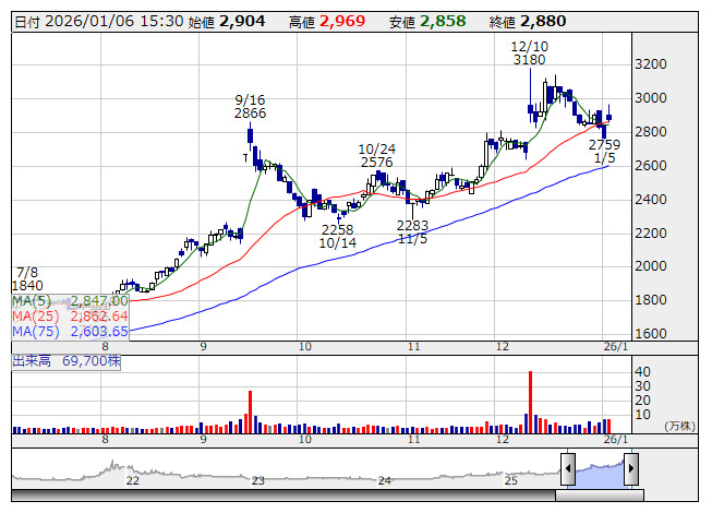 急騰。5日の取引終了後に、株式分割の実施を発表し、好材料視されている。26年1月31日を基準日として、同日(同日は株主名簿代理人の休業日につき、実質は26年1月30日)最終の株主名簿に記録された株主の所有普通株式1株につき、2株の割合をもって分割する。株式分割の目的は、株式を分割することにより同社株式の投資単位当たりの金額を引き下げることで、同社株式の流動性の向上と投資家層の拡大を図ることとしている。