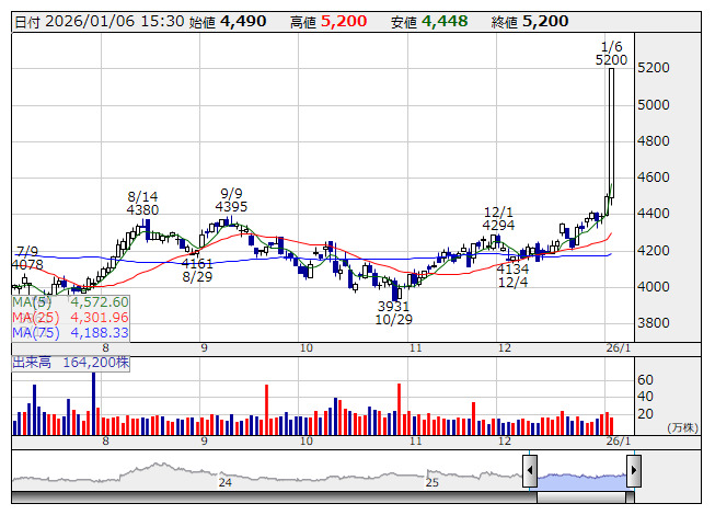 住友金属鉱山<5713>が大幅続伸。株価は一時前日比で7%超高の7163円まで値を上げ、株式併合考慮後の上場来高値を更新した。ニューヨーク商品取引所(COMEX)では金先物2月物が、前週末比121.9ドル高の1トロイオンス=4451.5ドルに上昇。トランプ米政権が3日、ベネズエラを攻撃し同国のマドゥロ大統領を拘束したことで、地政学リスクの高まりが警戒されるなか、安全資産の金に買いが流入している。金鉱山を保有する住友鉱がけん引する格好で三菱マテリアル<5711>やDOWAホールディングス<5714>、三井金属<5706>など非鉄株が軒並み値を上げている。